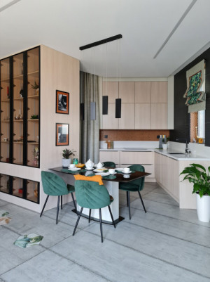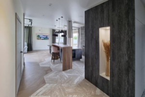 Полы приглашают повернуть взгляд направо в открытое пространство гостиной и кухни. Мебельную кухонную композицию мы начали сразу с порога. Она как остов разделяет прихожую, где можно пользоваться шкафчиками с дверями для уличных вещей. Торец шкафов украшает ниша с роскошными колосками в стеклянной вазе. За стеной по левую руку - кабинет. Прямо кухонный остров с барной стойкой.