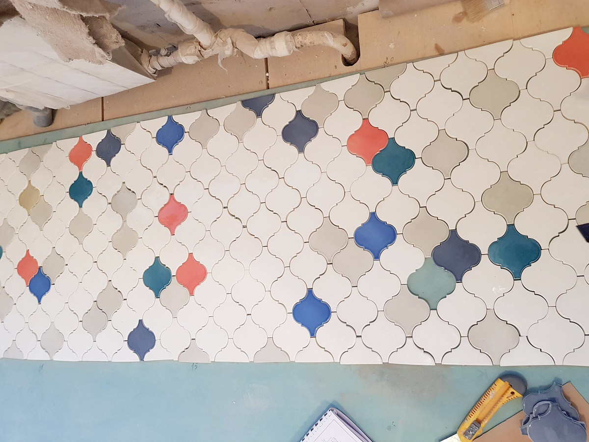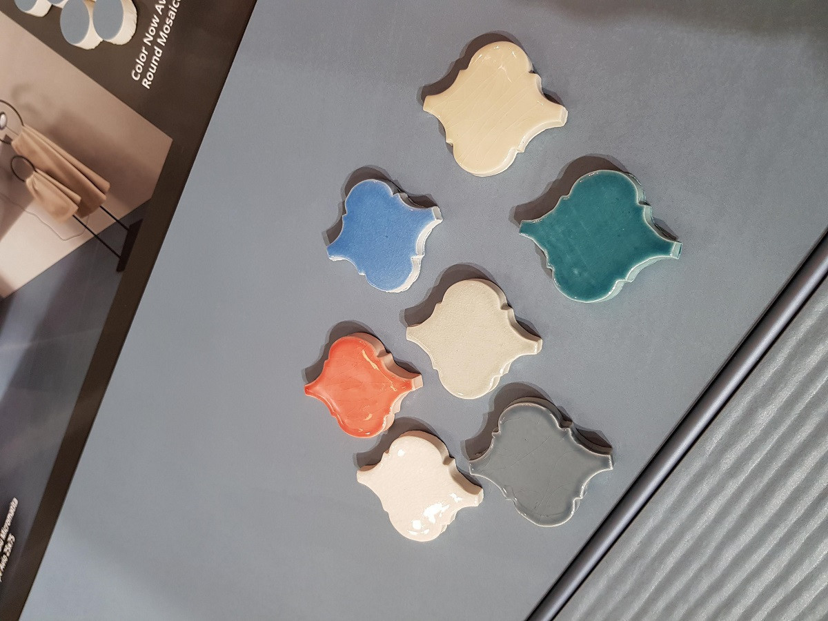 Элементы в виде восточной арабески, изготовленные вручную, имеют слегка криволинейную поверхность. Это придаёт поверхности в целом особый шарм. Лёгкие блики усиливают красивый эффект при движении на кухне.