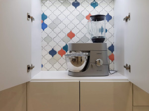 Или встроенный шкаф, в который можно установить все, что душе угодно. От дополнительной розетки, которая позволит одновременно готовить ужин и заряжать ноутбук, ведь никак нельзя пропустить видеозвонок с коллегами, до автомата с водой или как мы реализовали идею в дизайн-проекте кухни, где за закрытыми дверками шкафа спрятался кухонный комбайн – любимец хозяйки.
