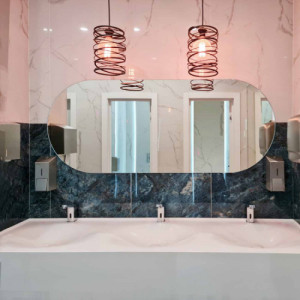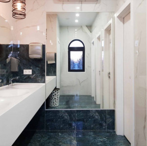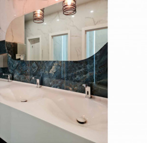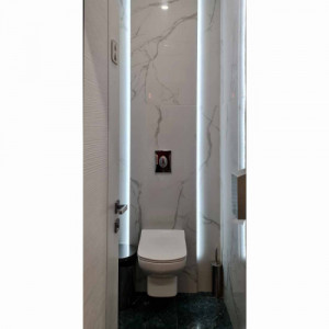 Облицовка санузла в комплексе произведена керамогранитом под белый мрамор. В сочетании с текстурой темной морской волны даёт ощущение чистоты и свежести. На белых дверях рельефные вставки как зябь белого песка после отлива воды.